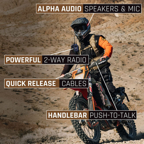 With Rugged-tough lightweight cabling, Snap-Lock Duralink connectors, easy-Install helmet kit with Alpha Audio speakers & noise canceling microphone, and a Quick-Release push-to-talk button that can be mounted on the handlebars or rider.